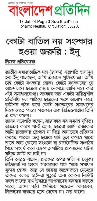 কোটা বাতিল নয় সংস্কার হওয়া জরুরি: ইনু