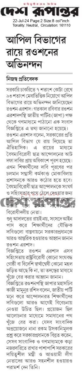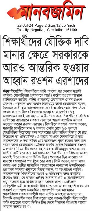 নিউজ ক্লিপসঃআপিল বিভাগের রায়ে রওশনের অভিনন্দন শিক্ষার্থীদের যৌক্তিক দাবি মানার ক্ষেত্রে সরকারকে আরও আন্তরিক হওয়ার আহ্বান রওশন এরশাদের