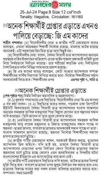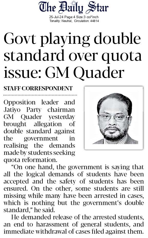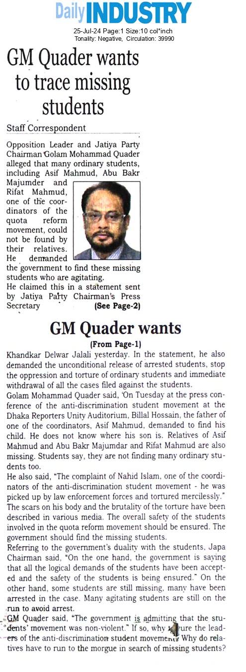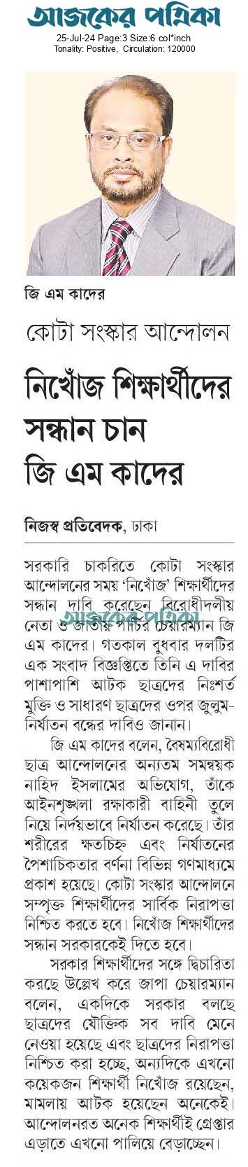 নিউজ ক্লিপসঃনিখোঁজ শিক্ষার্থীদের সন্ধান চান জি এম কাদের অনেক শিক্ষার্থীই গ্রেপ্তার এড়াতে এখনও পালিয়ে বেড়াচ্ছে: জি এম কাদের GM Quader wants to trace missing students Govt playing double standard over quota issue: GM Quader