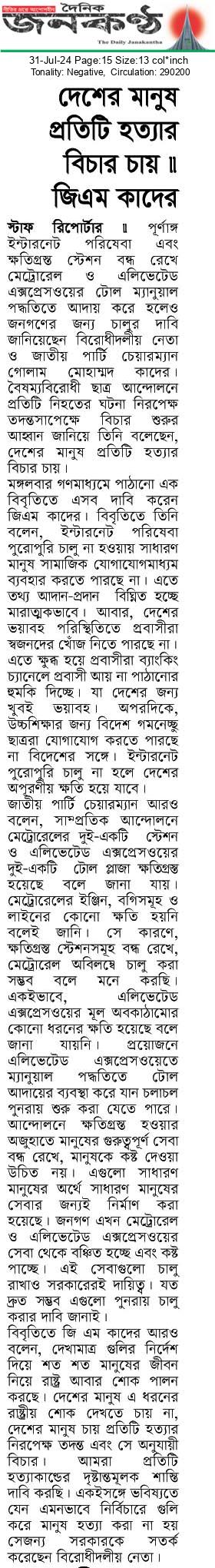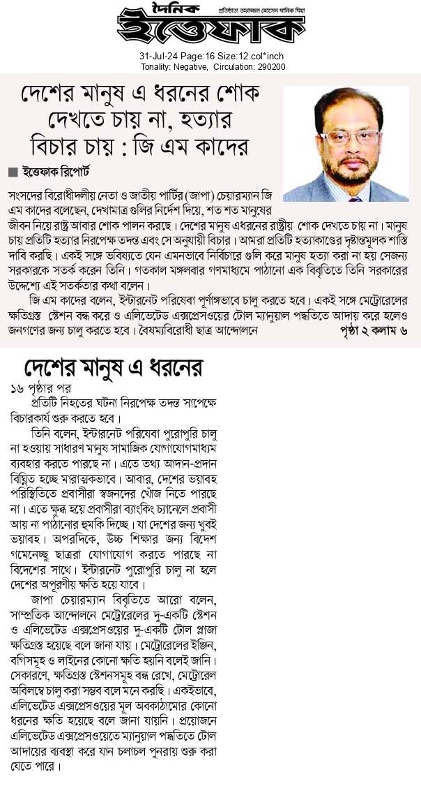 নিউজ ক্লিপসঃদেশের মানুষ এ ধরনের শোক দেখতে চায় না, হত্যার বিচার চায়: জি এম কাদের দেশের মানুষ প্রতিটি হত্যার বিচার চায়। জিএম কাদের
