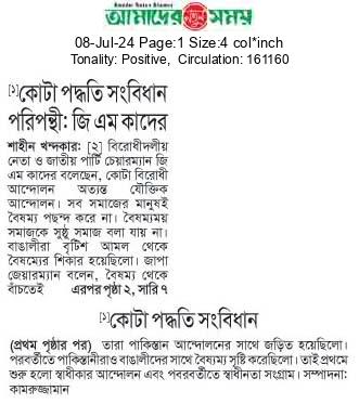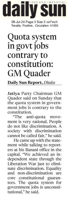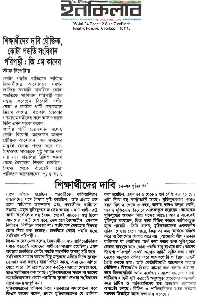 নিউজ ক্লিপসঃচাকরিতে কোটা পদ্ধতি সংবিধান পরিপন্থি -জিএম কাদের কোটা পদ্ধতি সংবিধান পরিপন্থী: জি এম কাদের Quota system in govt jobs contrary to constitution: GM Quader শিক্ষার্থীদের দাবি যৌক্তিক, কোটা পদ্ধতি সংবিধান পরিপন্থী: জি এম কাদের