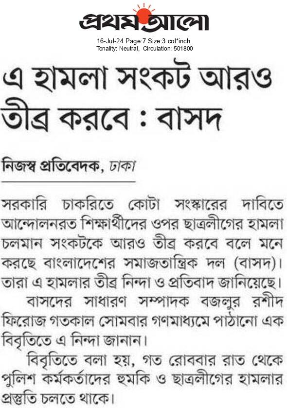 এ হামলা সংকট আরও তীব্র করবে : বাসদ