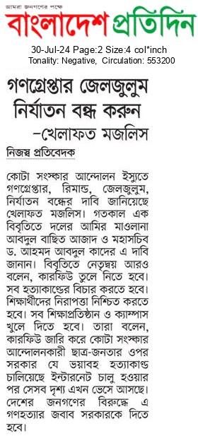 গণগ্রেপ্তার জেলজুলুম নির্যাতন বন্ধ করুন -খেলাফত মজলিস