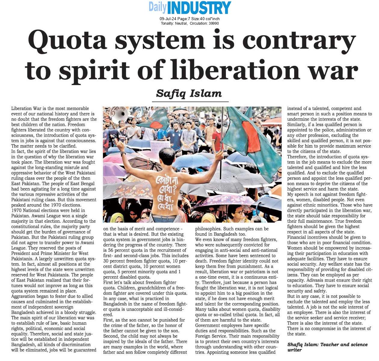 ৮ জুলাইAnti-quota movement: Ominous for government ৯ জুলাইQuota system is contrary to spirit of liberation war ২৫ জুলাইDid heroes make country free to paint soil with blood?- Jannatul Bakeya Keka