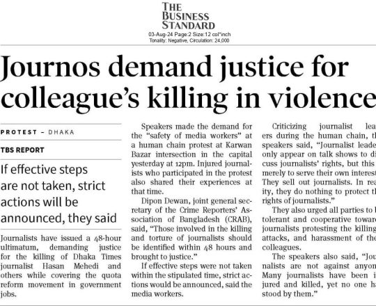 Business Standard, 3 August 2024, Journos demand justice for colleague's killing in violence