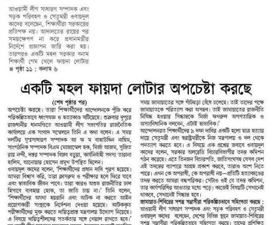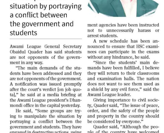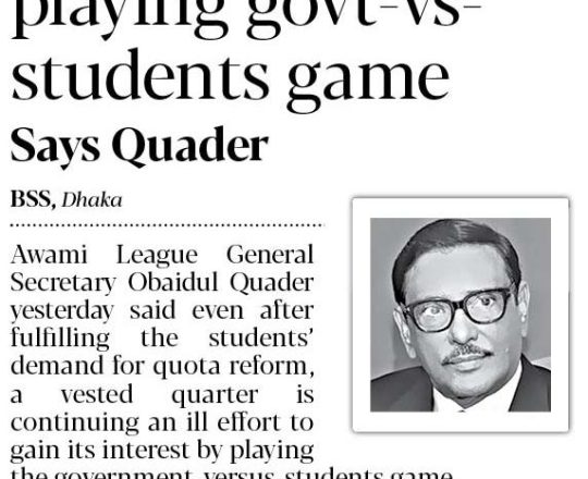 Daily Star, 3 August 2024, Vested people playing govt-vs-students game Says Quader