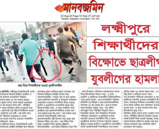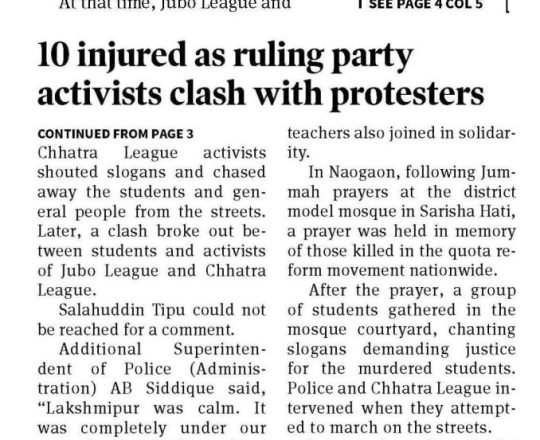 Business Standard, 3 August 2024, 10 injured as ruling party activists clash with protesters in Lakshmipur