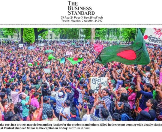 Business Standard, 3 August 2024, A protest march demanding justice for students and others killed in recent violent clashes across the country