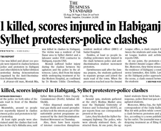 Business Standard, 3 August 2024, 1 killed, scores injured in Habiganj, Sylhet protesters-police clashes