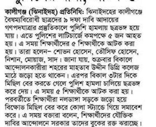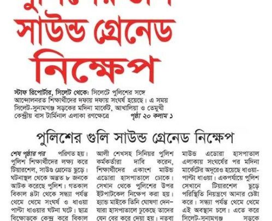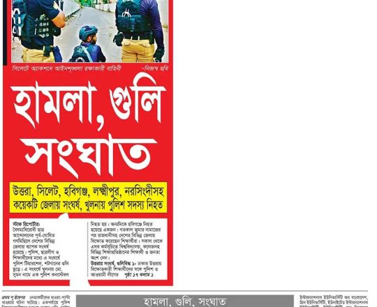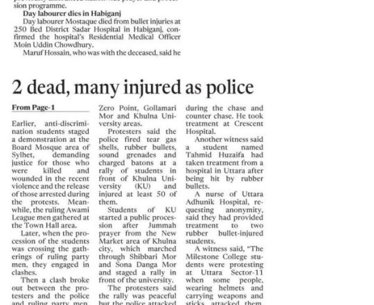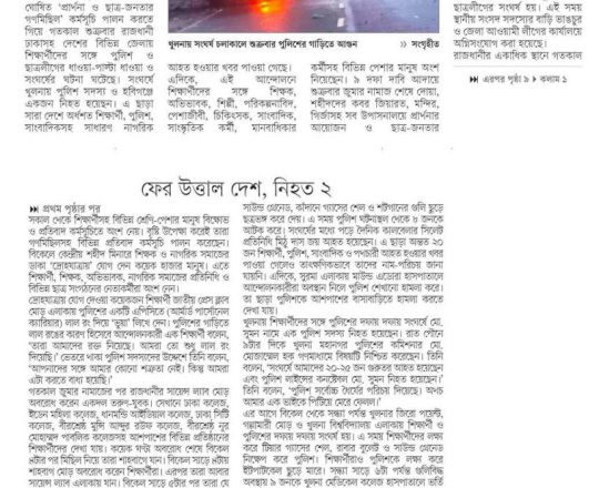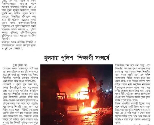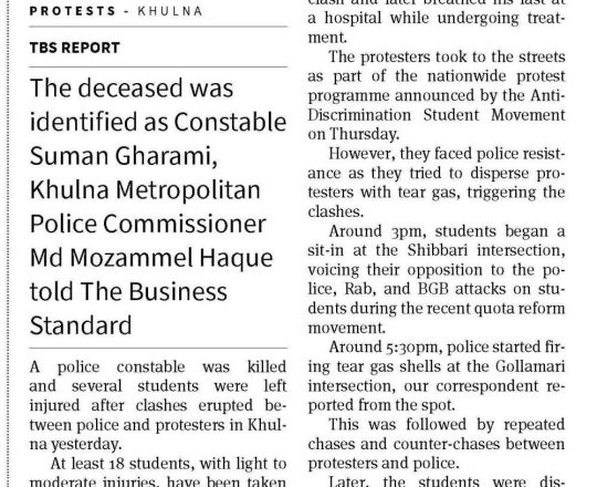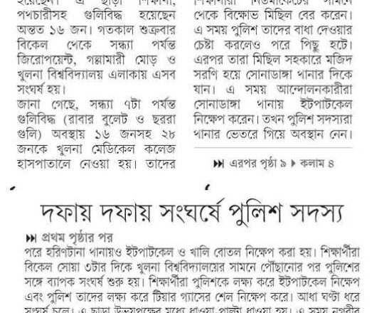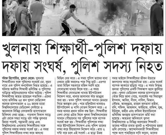 যুগান্তর, ৩ আগস্ট ২০২৪, খুলনায় পুলিশ শিক্ষার্থী সংঘর্ষে কনস্টেবল নিহত গুলিবিদ্ধসহ আহত শতাধিক