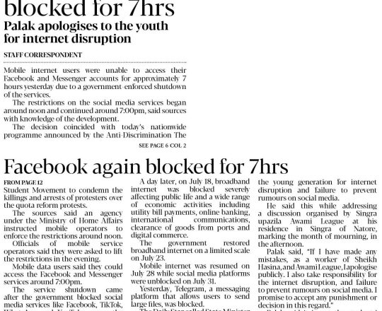Daily Star, 3 August 2024, Facebook again blocked for 7hrs