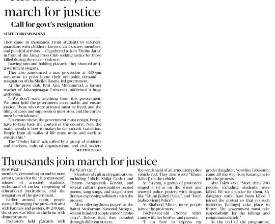 প্রথম আলো, ৩ আগস্ট ২০২৪, প্রতিবাদে শামিল সর্বস্তরের মানুষ