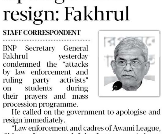 Daily Star, 3 August 2024, Apologise and resign: Fakhrul