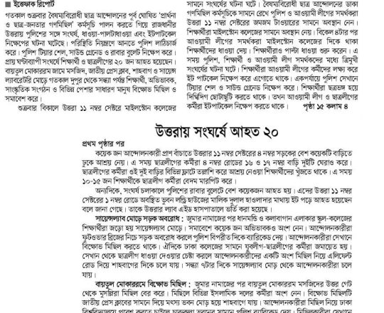 ইত্তেফাক, ৩ আগস্ট ২০২৪, উত্তরায় সংঘর্ষে আহত ২০, সায়েন্সল্যাবসহ বিভিন্ন স্থানে বিক্ষোভ, পুলিশের বাধা