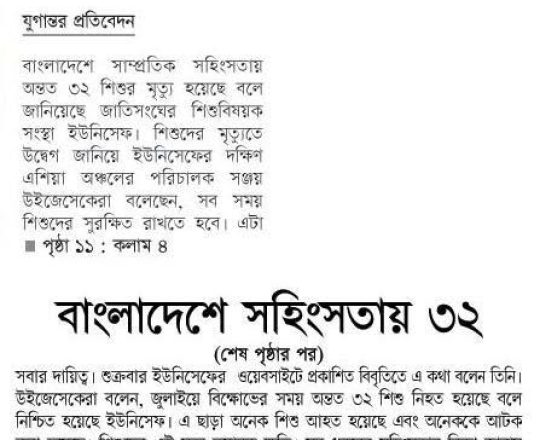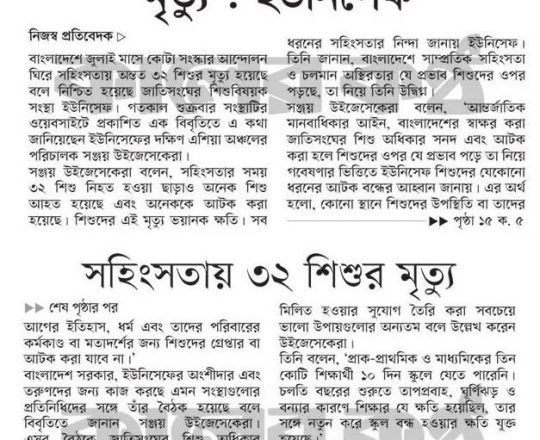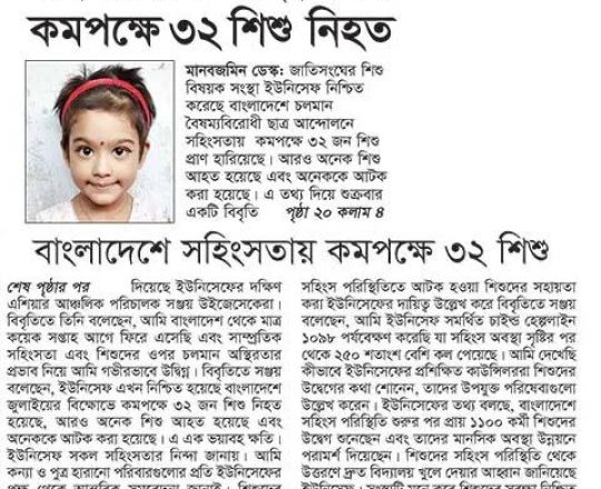 যুগান্তর, ৩ আগস্ট ২০২৪, বাংলাদেশে সহিংসতায় ৩২ শিশুর মৃত্যু -ইউনিসেফ