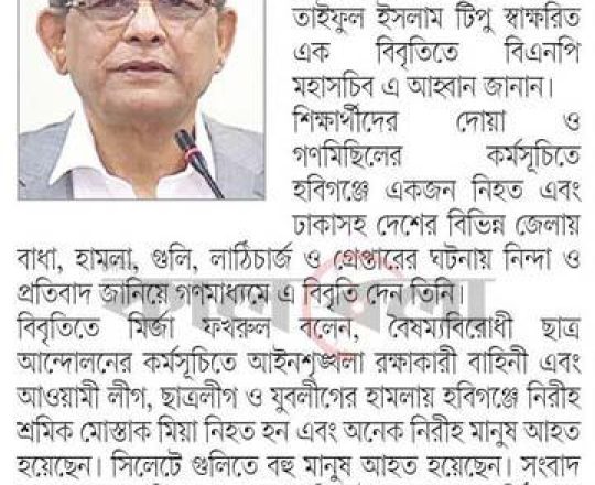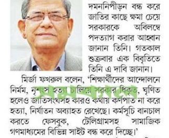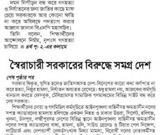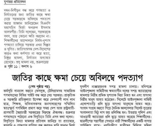 যুগান্তর, ৩ আগস্ট ২০২৪, জাতির কাছে ক্ষমা চেয়ে অবিলম্বে পদত্যাগ করুন- সরকারকে মির্জা ফখরুল