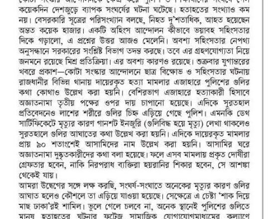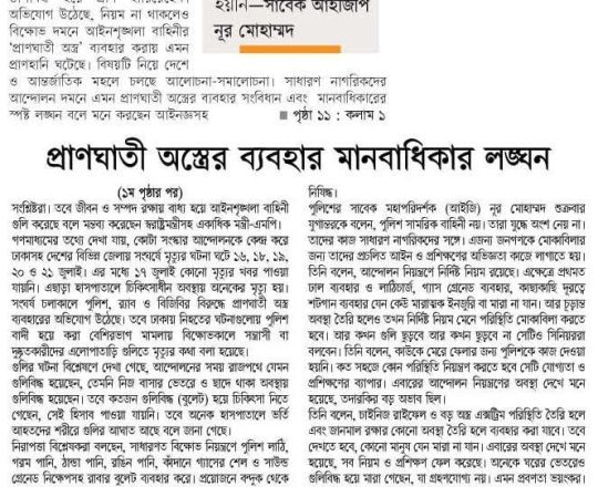 যুগান্তর, ৩ আগস্ট ২০২৪, প্রাণঘাতী অস্ত্রের ব্যবহার মানবাধিকার লঙ্ঘন