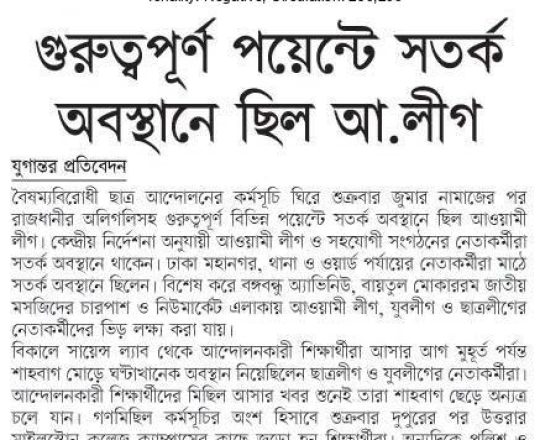 যুগান্তর, ৩ আগস্ট ২০২৪, গুরুত্বপূর্ণ পয়েন্টে সতর্ক অবস্থানে ছিল আ.লীগ