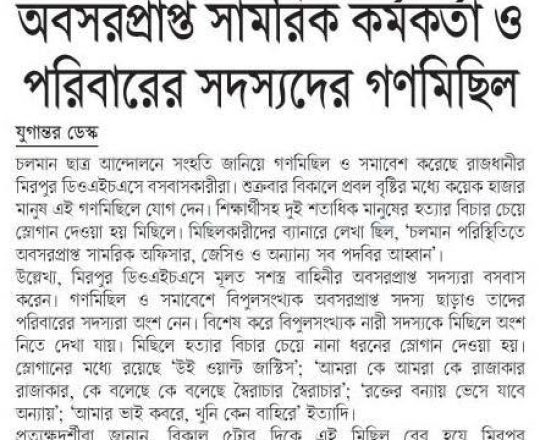 যুগান্তর, ৩ আগস্ট ২০২৪, অবসরপ্রাপ্ত সামরিক কর্মকর্তা ও পরিবারের সদস্যদের গণমিছিল