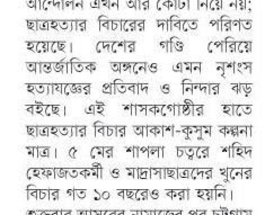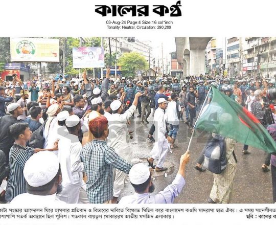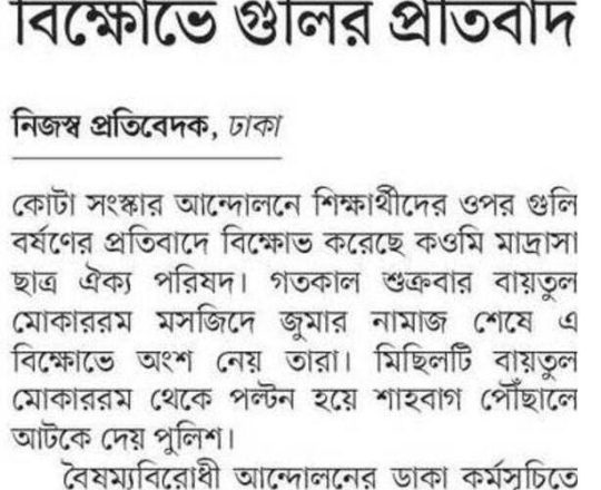 প্রথম আলো, ৩ আগস্ট ২০২৪, কওমি মাদ্রাসা ছাত্র ঐক্য পরিষদ বিক্ষোভে গুলির প্রতিবাদ