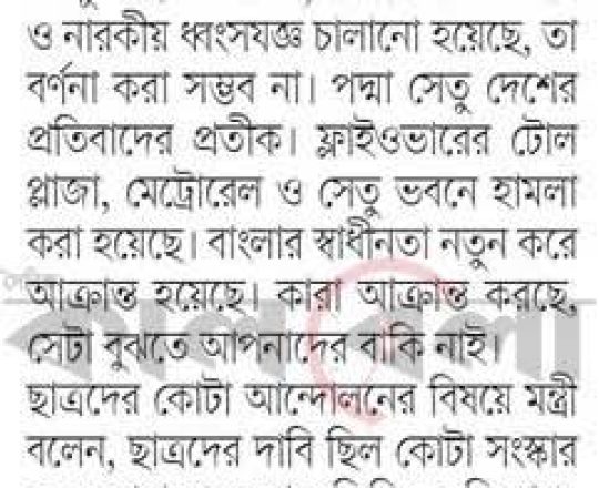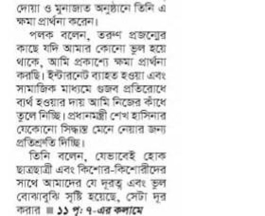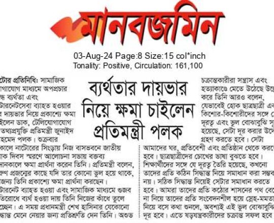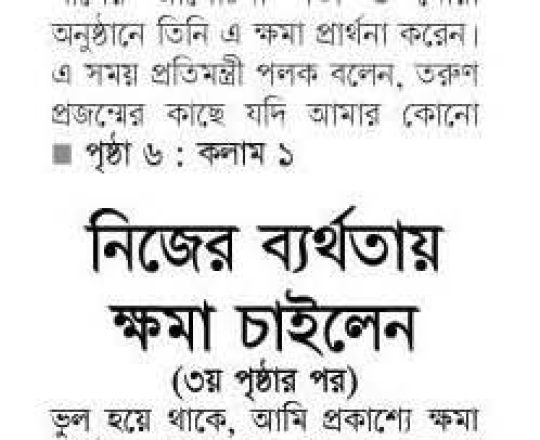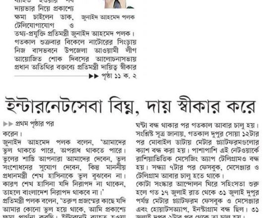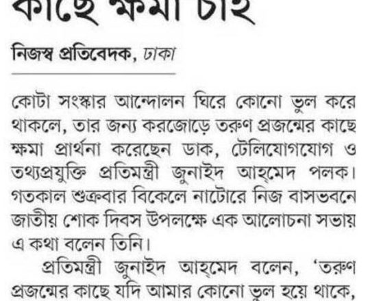 যুগান্তর, ৩ আগস্ট ২০২৪, নিজের ব্যর্থতায় ক্ষমা চাইলেন প্রতিমন্ত্রী পলক
