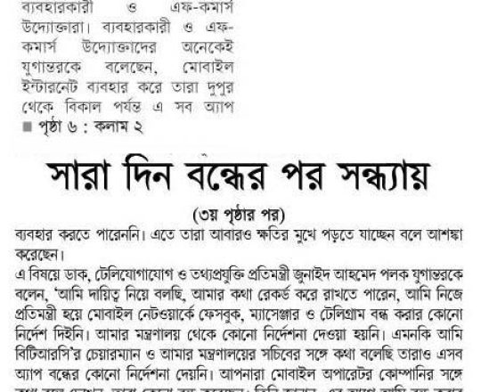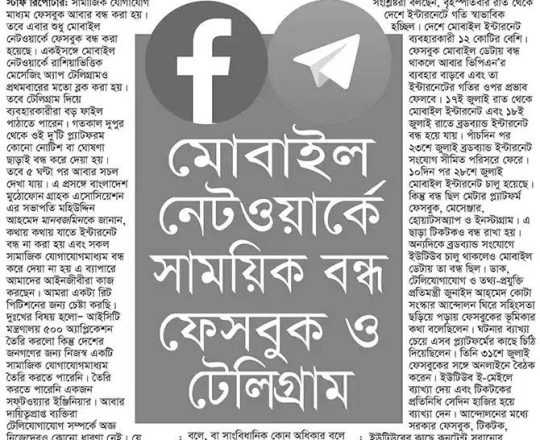 যুগান্তর, ৩ আগস্ট ২০২৪, মোবাইল নেটওয়ার্কে অসন্তোষ সারা দিন বন্ধের পর সন্ধ্যায় সচল ফেসবুক