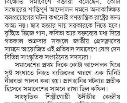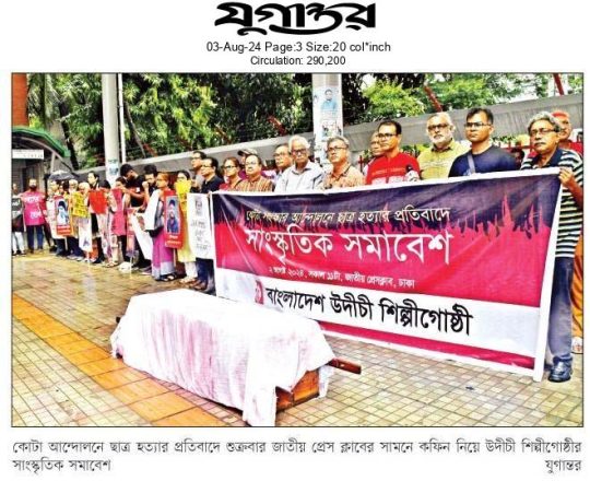 যুগান্তর, ৩ আগস্ট ২০২৪, ছাত্র হত্যার প্রতিবাদে শুক্রবার জাতীয় প্রেস ক্লাবের সামনে কফিন নিয়ে উদীচী শিল্পীগোষ্ঠীর সাংস্কৃতিক সমাবেশ