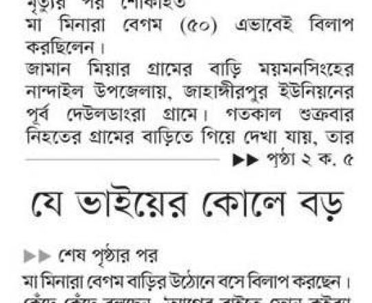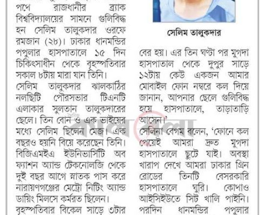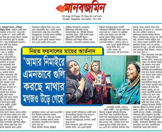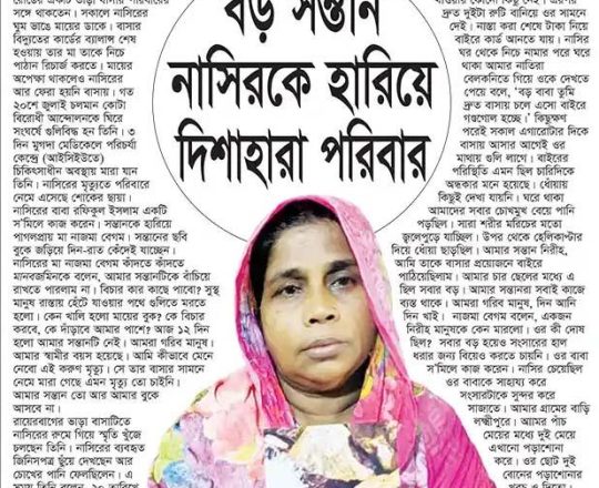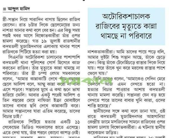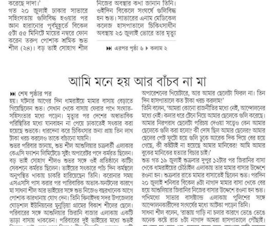 যুগান্তর, ৩ আগস্ট ২০২৪, কোটা আন্দোলনে নিহত রাকিবের মায়ের আহাজারি