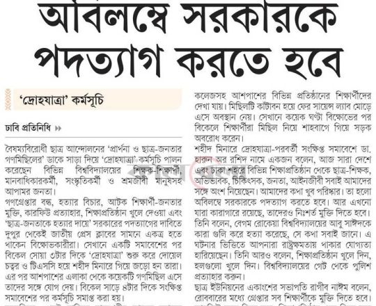সমকাল, ৩ আগস্ট ২০২৪, 'দ্রোহযাত্রায়' পদত্যাগ দাবি সরকারের