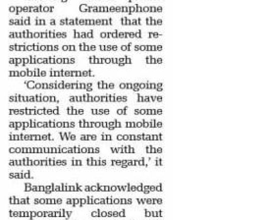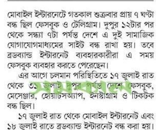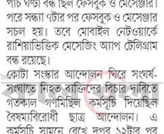 সমকাল, ৩ আগস্ট ২০২৪, মোবাইল ফেসবুক ও টেলিগ্রাম বন্ধ ছিল ৭ ঘণ্টা ইন্টারনেটে