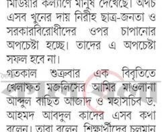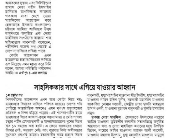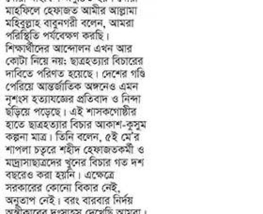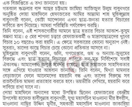 যুগান্তর, ৩ আগস্ট ২০২৪, দাবি এখন ছাত্র জনতা হত্যার বিচার -হেফাজত আমির