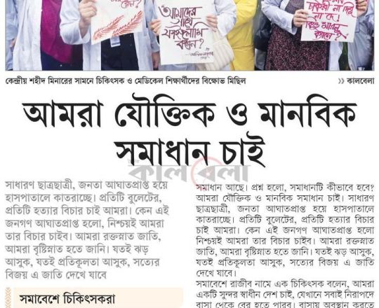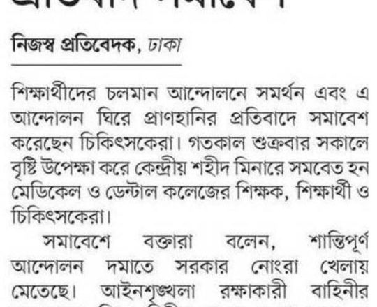 প্রথম আলো, ৩ আগস্ট ২০২৪, মেডিকেল-ডেন্টালের শিক্ষক-শিক্ষার্থীদের প্রতিবাদ সমাবেশ