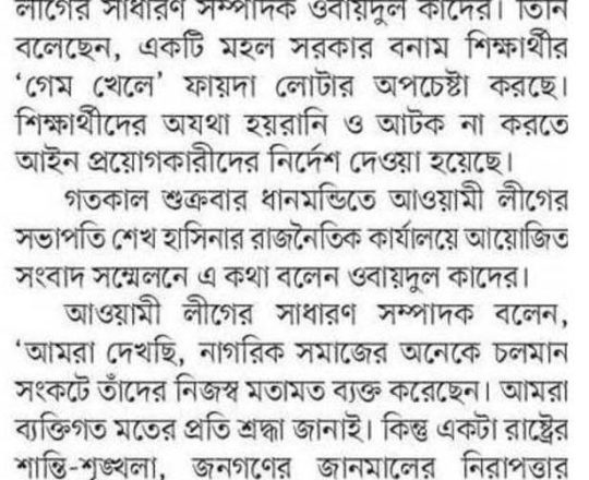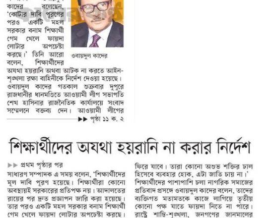 সমকাল, ৩ আগস্ট ২০২৪, ওবায়দুল কাদের বললেন শিক্ষার্থীরা যেন কারও ঢাল হিসেবে ব্যবহার না হয়