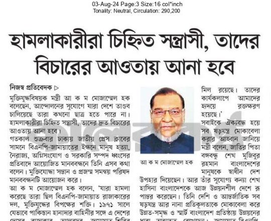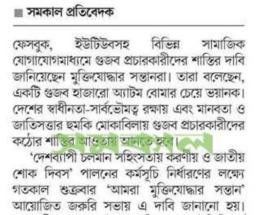 সমকাল, ৩ আগস্ট ২০২৪, গুজব প্রচারকারীদের শাস্তির আওতায় আনতে হবে