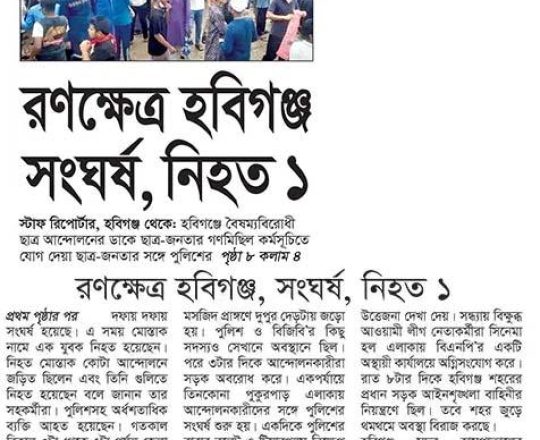 Dhakatribune,03-Aug Quota reform protest: One killed in Habiganj clash