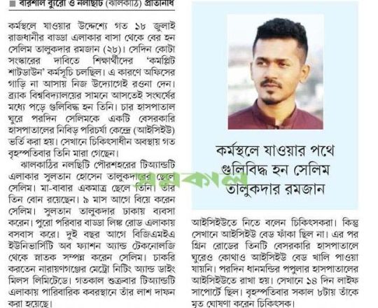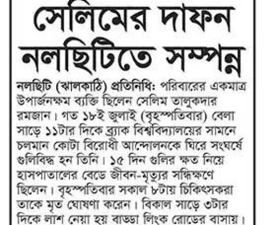 প্রথম আলো,৩ আগস্ট,১৫ দিন চিকিৎসাধীন থেকে গুলিবিদ্ধ আরেক যুবকের মৃত্যু, নলছিটিতে দাফন