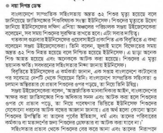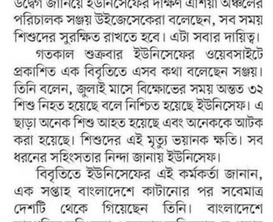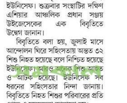 কালবেলা, ৩ আগস্ট ২০২৪, বাংলাদেশে সহিংসতায় অন্তত ৩২ শিশু নিহত- ইউনিসেফ