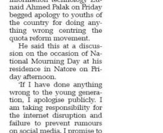 প্রথম আলো, ৩ আগস্ট ২০২৪, ভুল হয়ে থাকলে তরুণ প্রজন্মের কাছে ক্ষমা চাই- প্রতিমন্ত্রী জুনাইদ আহমেদ