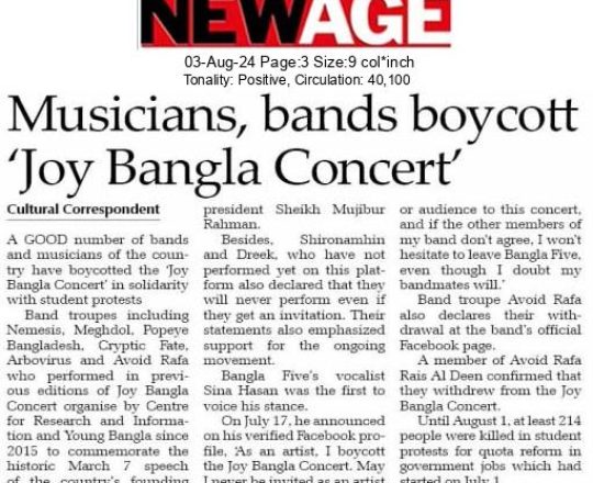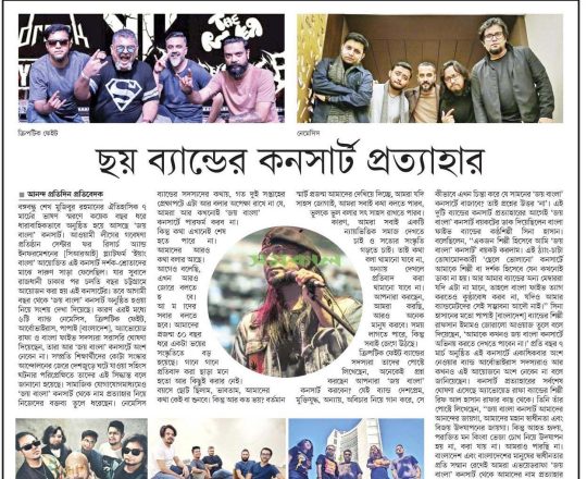 সমকাল, ৩ আগস্ট ২০২৪, ছয় ব্যান্ডের কনসার্ট প্রত্যাহার