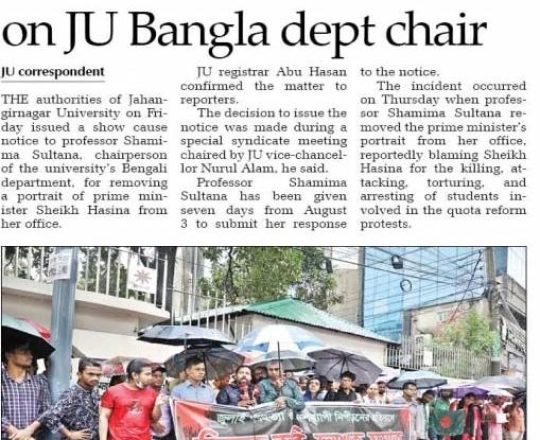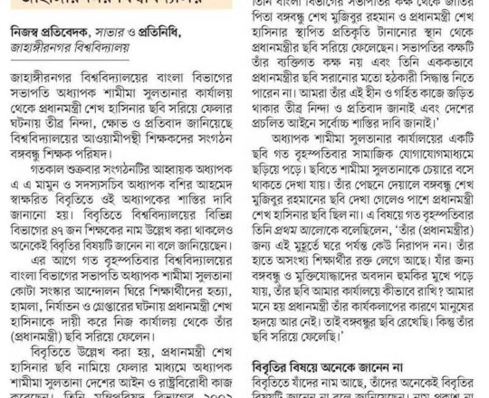 প্রথম আলো, ৩ আগস্ট ২০২৪, প্রধানমন্ত্রীর ছবি সরানোর ঘটনায় আওয়ামীপন্থী শিক্ষকদের নিন্দা