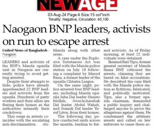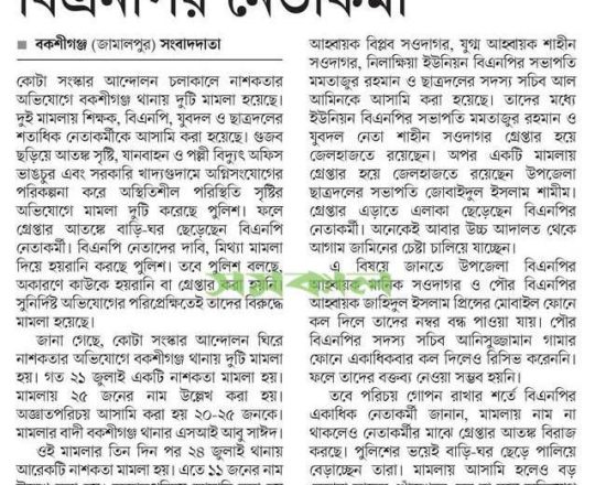 সমকাল, ৩ আগস্ট ২০২৪, আতঙ্কে পালিয়ে বেড়াচ্ছেন বিএনপির নেতাকর্মী