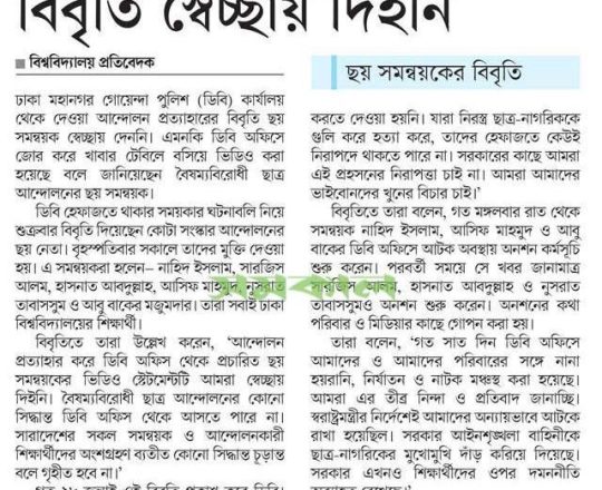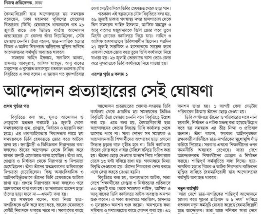 যুগান্তর, ৩ আগস্ট ২০২৪, আন্দোলন প্রত্যাহারের বার্তা স্বেচ্ছায় দেওয়া হয়নি