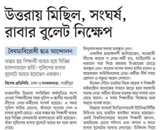 প্রথম আলো, ৩ আগস্ট ২০২৪, উত্তরায় মিছিল, সংঘর্ষ, রাবার বুলেট নিক্ষেপ