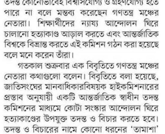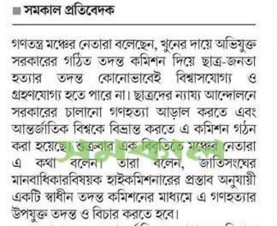 সমকাল, ৩ আগস্ট ২০২৪, গণতন্ত্র মঞ্চের নেতারা বললেন তদন্ত কমিশন গঠন করা হয়েছে গণহত্যা আড়াল করতেই