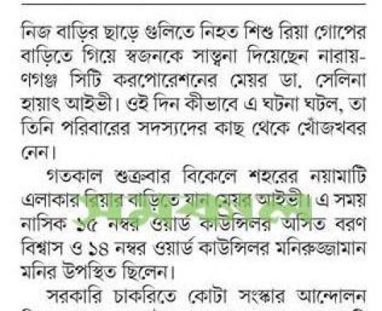 সমকাল, ৩ আগস্ট ২০২৪, ছাদে গুলিবিদ্ধ হয়ে নিহত শিশু রিয়ার বাড়িতে আইভী