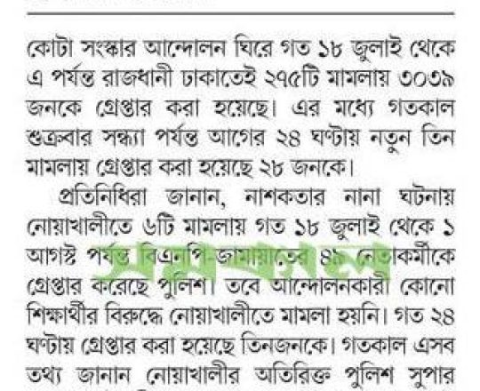 ইত্তেফাক, ৩ আগস্ট ২০২৪, নারায়ণগঞ্জে ৩০ মামলায় আটক ছয় শতাধিক