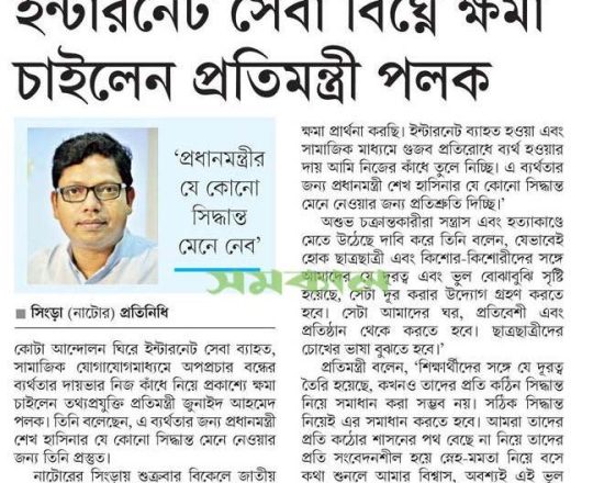 সমকাল, ৩ আগস্ট ২০২৪, ইন্টারনেট সেবা বিঘ্নে ক্ষমা চাইলেন প্রতিমন্ত্রী পলক