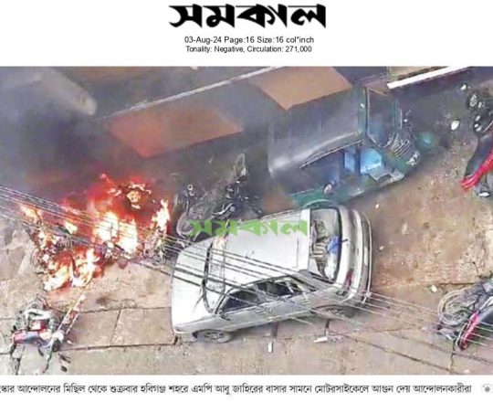 সমকাল, ৩ আগস্ট ২০২৪, এমপি আবু জাহিরের বাসার সামনে মোটরসাইকেলে আগুন দেয় আন্দোলনকারীরা