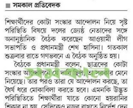 সমকাল, ৩ আগস্ট ২০২৪, শিক্ষার্থীরা যাতে হয়রানির শিকার না হয় নজর রাখুন- বৈঠকে জ্যেষ্ঠ নেতাদের প্রধানমন্ত্রী