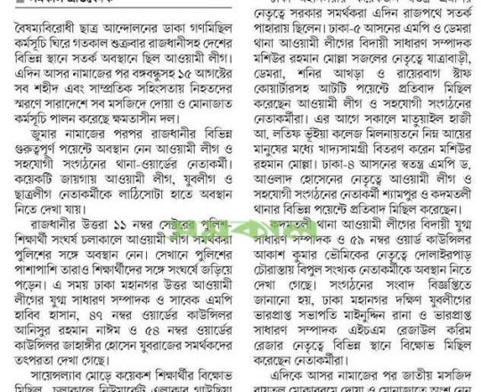 সমকাল, ৩ আগস্ট ২০২৪, রাজধানীসহ বিভিন্ন স্থানে আ'লীগের সতর্ক অবস্থান